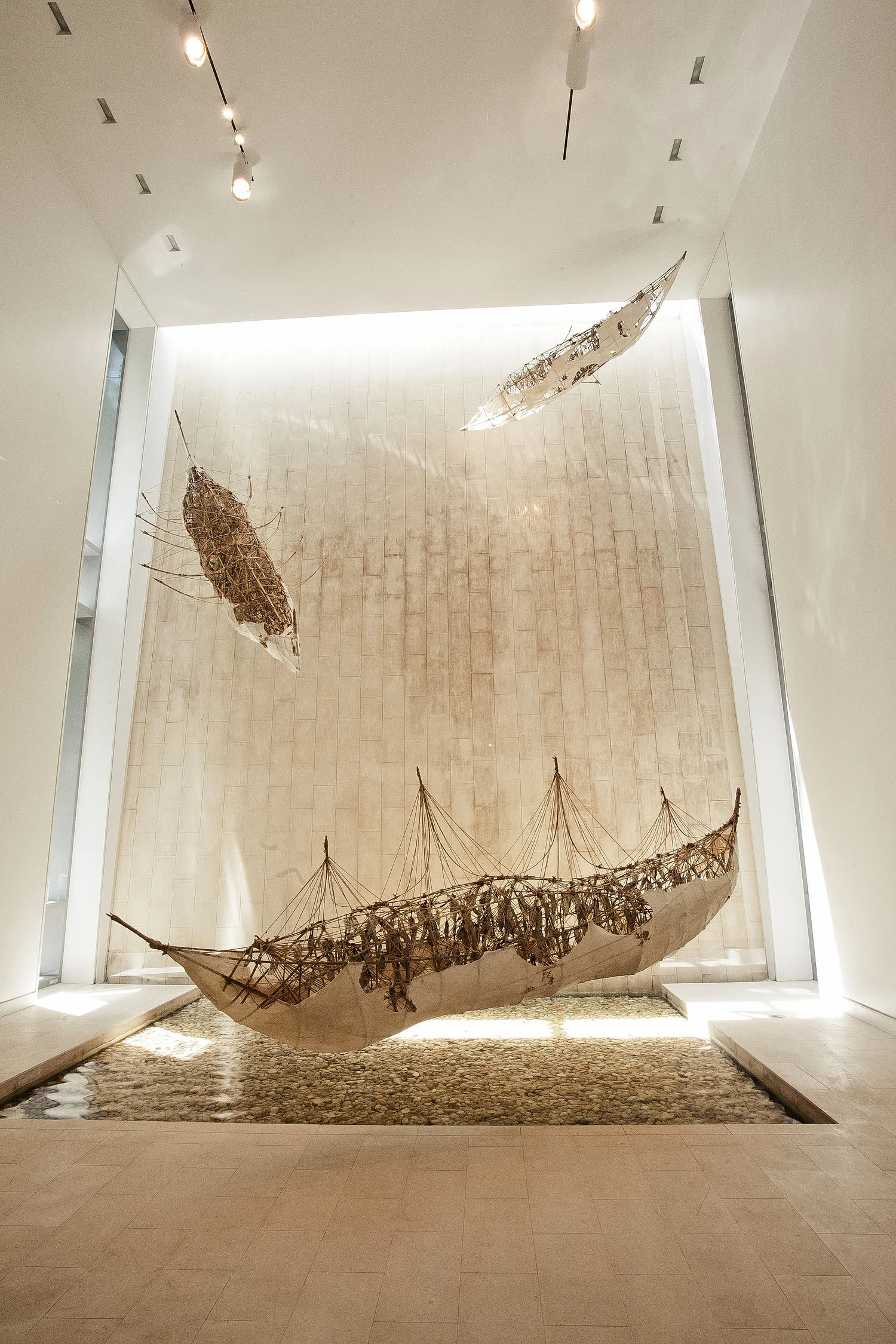 A breathtaking 22 foot indoor waterfall serves as the heart of the gallery space. Installation Artwork “Meditation Ships” by Jinwon Chang